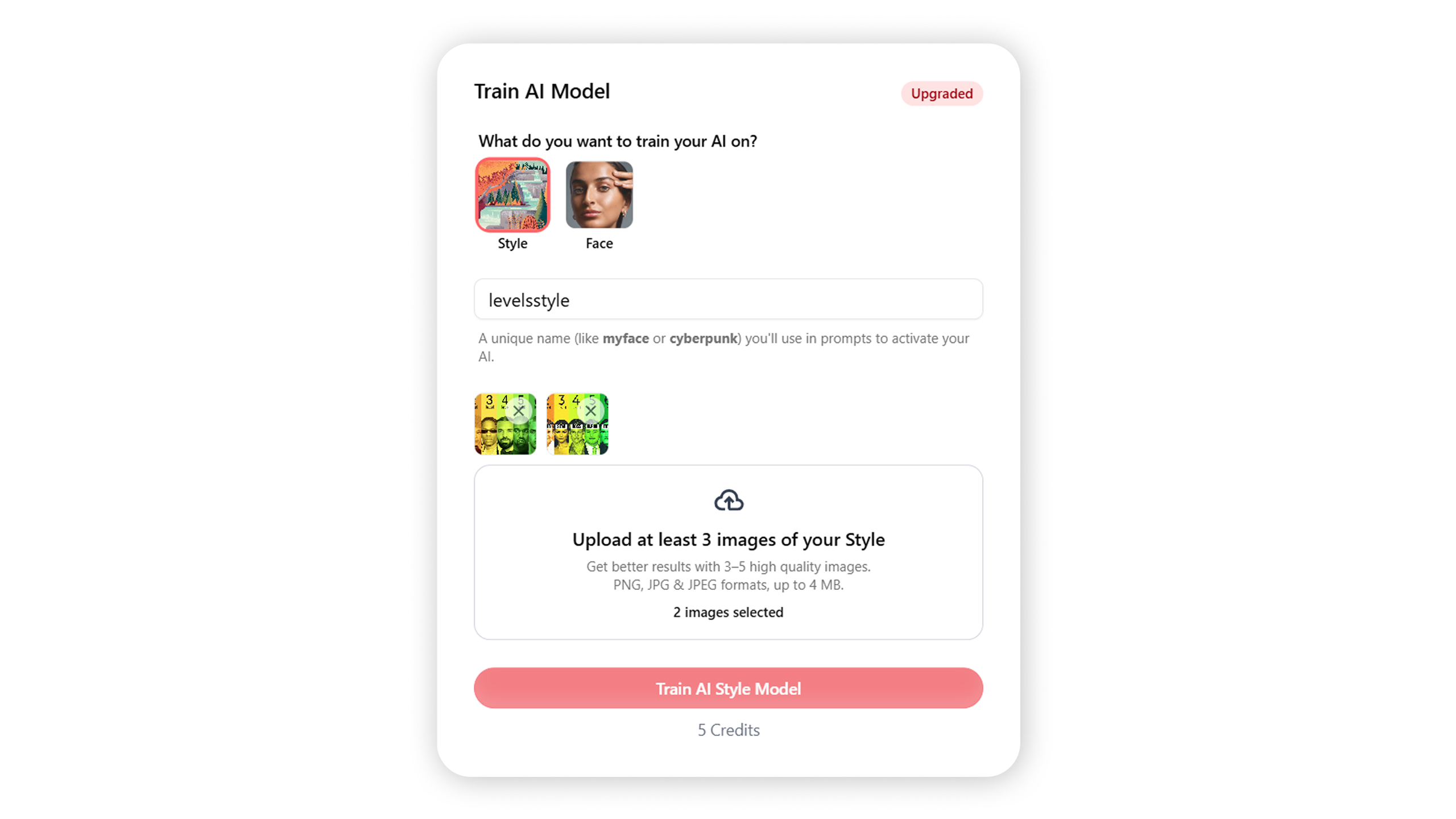 Next, log in to ThumblifyAI and go to the Train AI section. Click Train AI Model and select the Style option. Give your style a unique name, for examplelevelsstyle or blenderstyle.